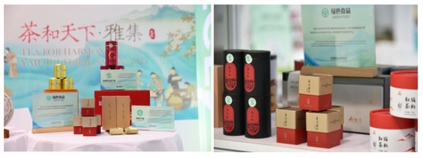 “茶和天下”展館以唐風宋韻為設計內(nèi)核,入口處巨幅國畫再現(xiàn)唐代制茶盛景,蒼勁的“茶和天下”題字與茶香交織,瞬間將觀眾帶入千年茶文化長河。展區(qū)內(nèi),奉化曲毫、余姚瀑布仙茗等國家地理標志產(chǎn)品與東海龍舌、彌勒紅茶、雨易紅等綠色食品認證茶品分列陳列,輔以茶史講解、制茶工藝展示,成為中外客商了解寧波茶文化的窗口。